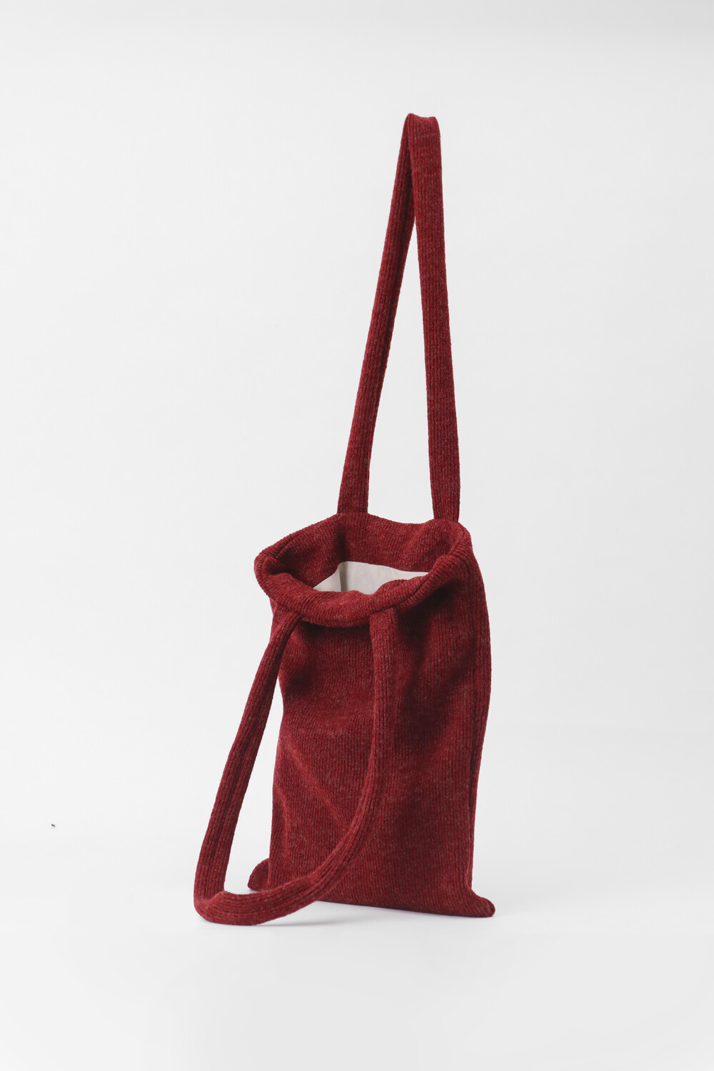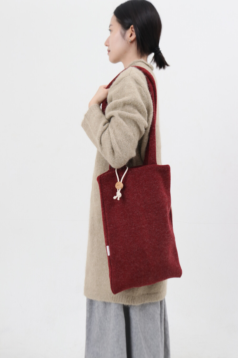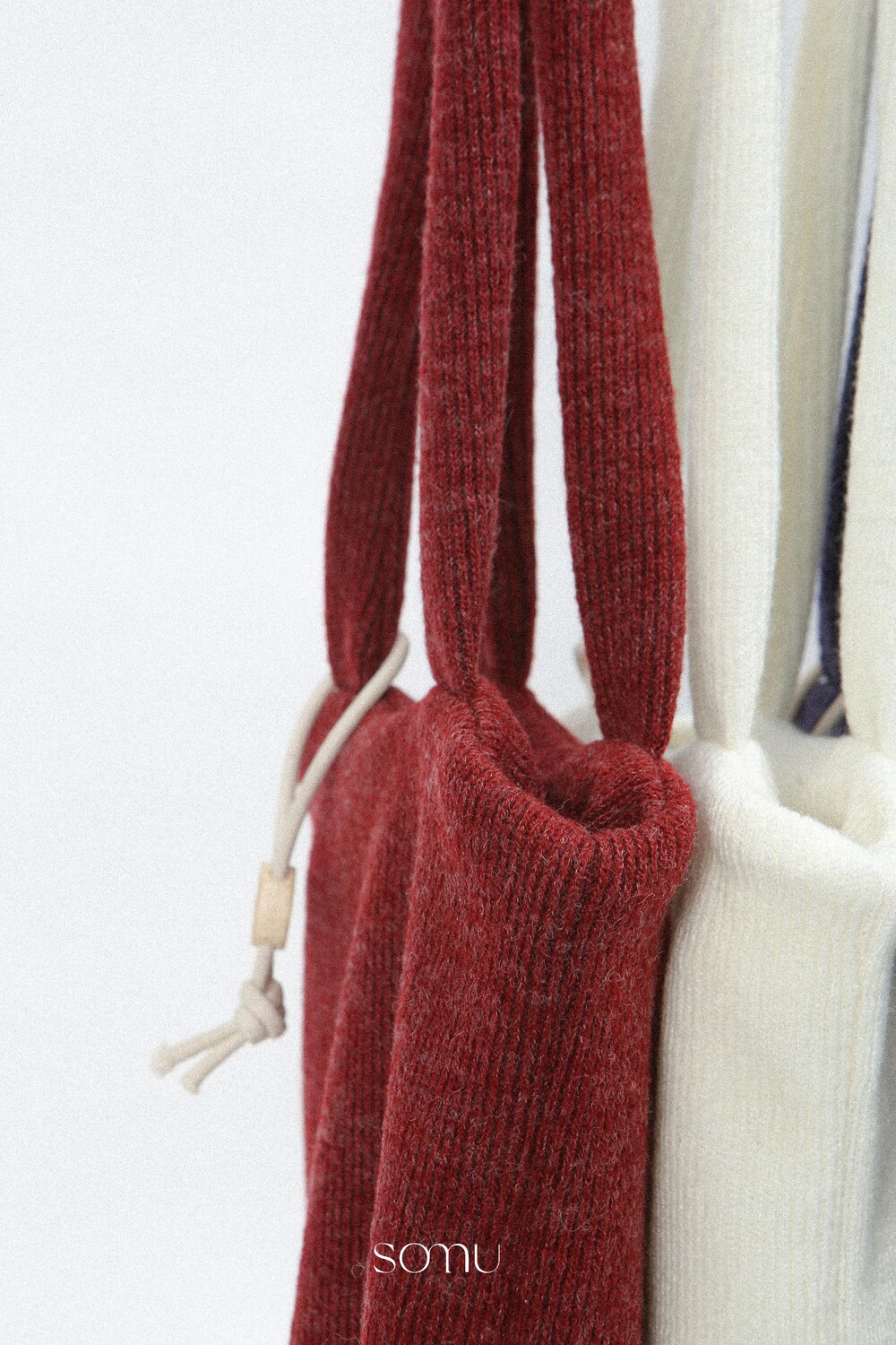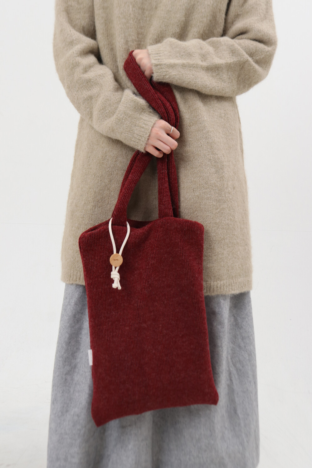 The KNIT COZY BAG is made from ribbed knit fabric, featuring a soft and cozy texture.