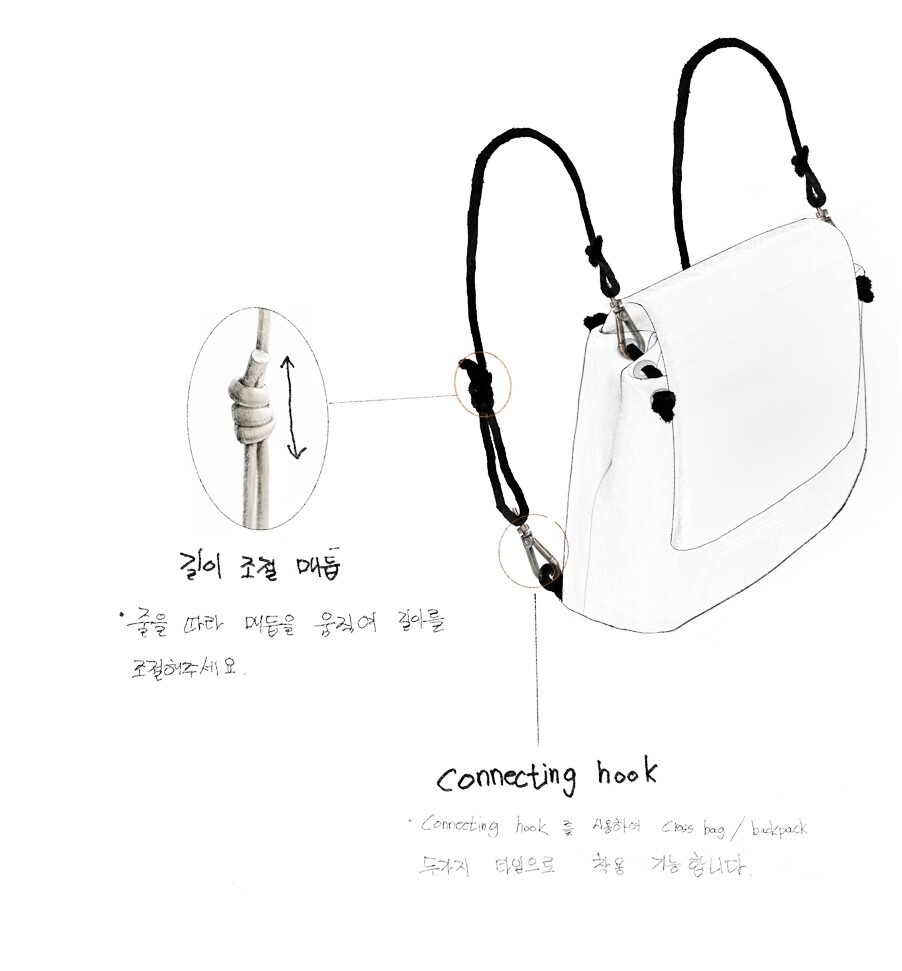 -가방 끈에 연결 된 connecting hook 을 사용 하여 cross bag / backpack 두가지 타입으로 착용 가능합니다.