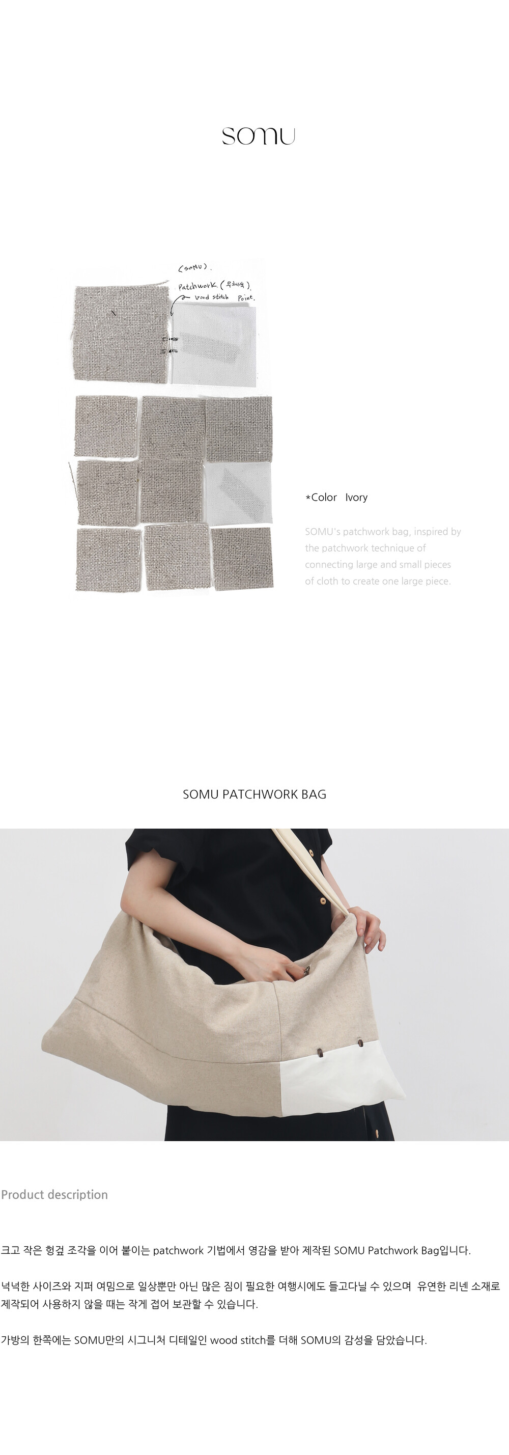 -크고 작은 헝겊 조각을 하나의 큰 조각으로 이어 붙이는 patchwork 기법에서 영감을 받아 제작된, SOMU Patchwork Bag 입니다.