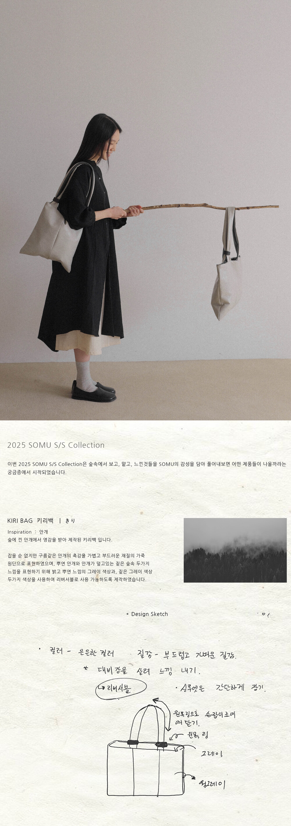 -뿌연 안개와 안개가 덮고있는 짙은 숲속 두가지 느낌을 표현하기 위해 밝고 뿌연 느낌의 그레이 색상과, 짙은 그레이 색상 두가지 색상을 사용하여 리버서블로 사용 가능하도록 제작하였습니다.