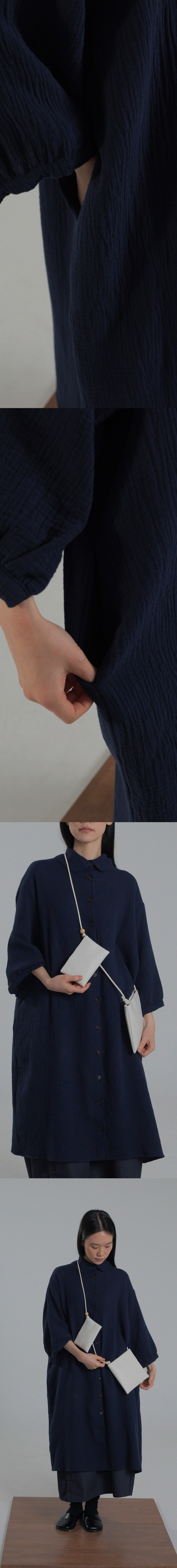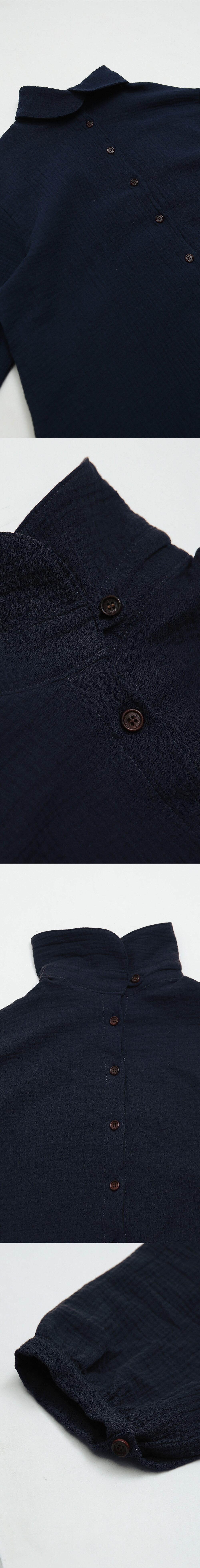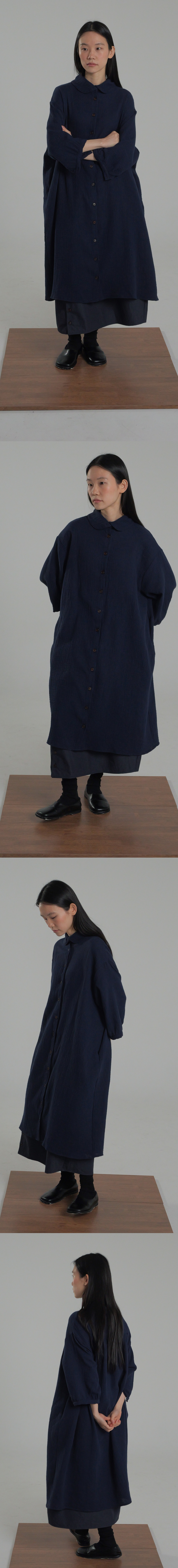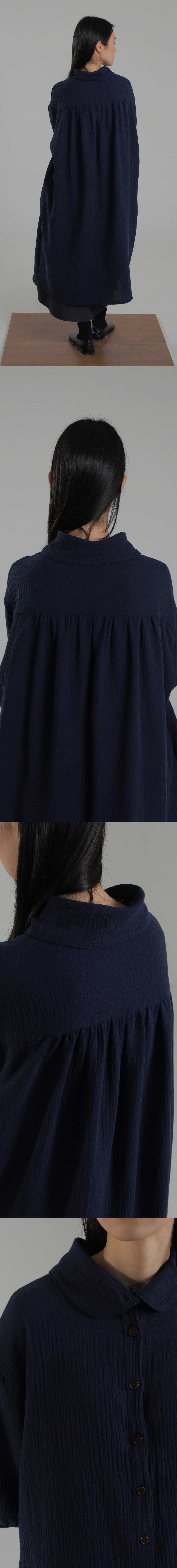 -부드러운 주름감이 살아 있는 이중 요루지 원단에 라운드 카라와 원목 단추 디테일이 어우러진 차분한 무드의 maru Long Shirtt입니다.