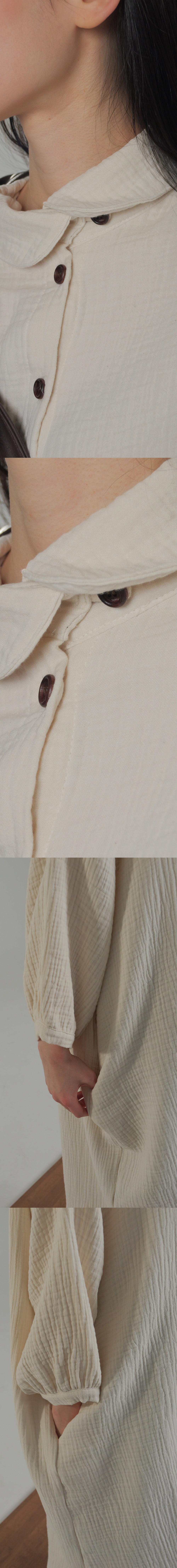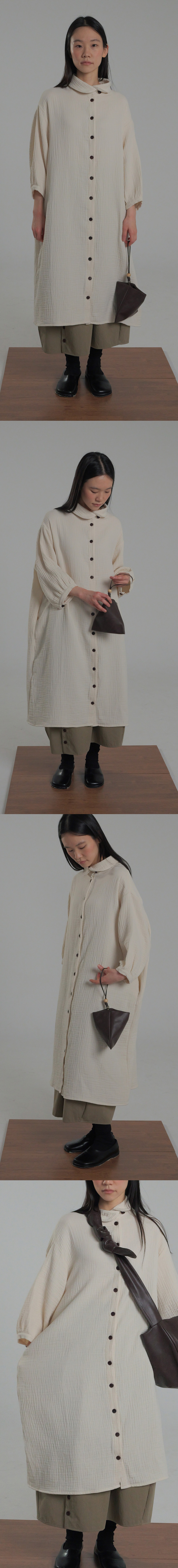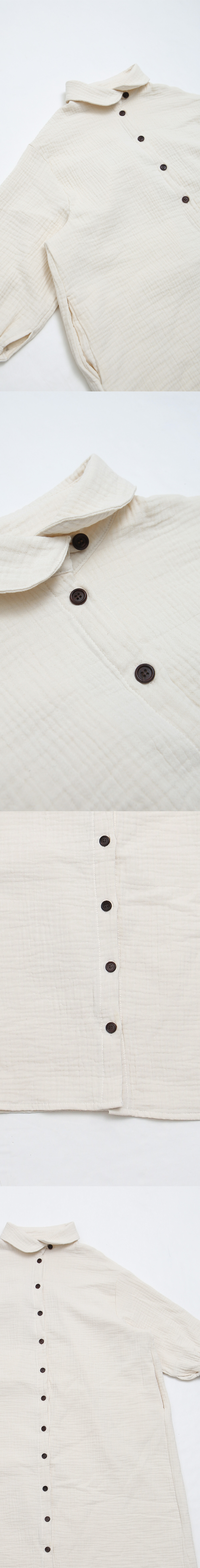 -부드러운 주름감이 살아 있는 이중 요루지 원단에 라운드 카라와 원목 단추 디테일이 어우러진 차분한 무드의 maru Long Shirtt입니다.